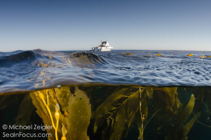 The dive boat Peace at Santa Barbara Island.[/caption] Split shots like this are easiest to capture with a fisheye lens and larger dome port like the Sea & Sea 8" port. Nikon D7000, Tokina 10-17 @15mm, 1/320, ?/16, ISO 400.